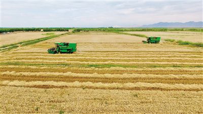 巴彥淖爾市臨河區(qū)新華鎮(zhèn)十萬畝高產(chǎn)高效糧食生產(chǎn)示范園區(qū)小麥豐收。本報記者 孟和朝魯 攝