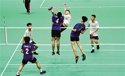 - 11月7日,代表內(nèi)蒙古出戰(zhàn)的呼倫貝爾市牙克石一中的運(yùn)動(dòng)員(白色)在毽球中學(xué)組男子三人比賽中進(jìn)攻。當(dāng)日,第一屆全國(guó)學(xué)生(青年)運(yùn)動(dòng)會(huì)毽球(校園組)比賽在廣西民族大學(xué)體育館進(jìn)行,內(nèi)蒙古隊(duì)的運(yùn)動(dòng)員主要由22名來(lái)自呼倫貝爾市牙克石一中和呼倫貝爾市職業(yè)技術(shù)學(xué)院的學(xué)生組成,他們分別參加中學(xué)組和大學(xué)組的比拼。…