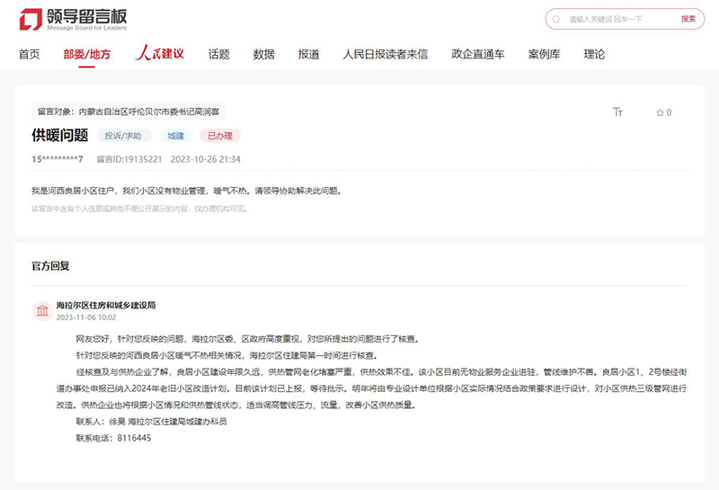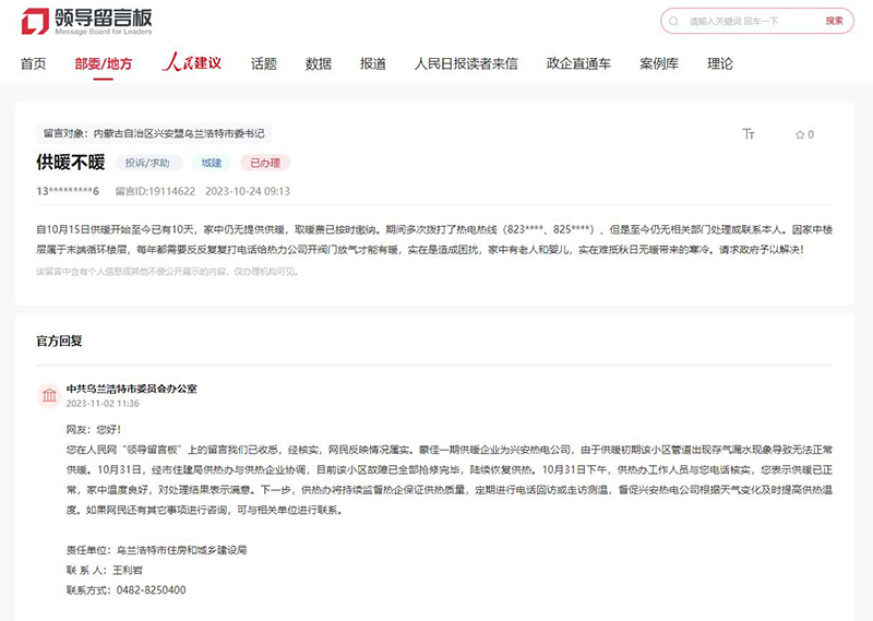 當前,內蒙古各地已進入供暖季。隨著冷空氣來襲,各地居民對供暖問題的關注度也逐步提高。人民網“領導留言板”上就收到了不少網友留言,反映暖氣不熱、室溫不達標等問題,得到了有關部門回應及辦理。
