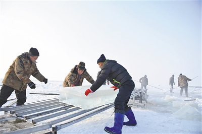 工人師傅們正在搬運冰塊。