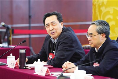 3月5日,住內(nèi)蒙古全國政協(xié)委員武強(左)在審議政協(xié)常委會工作報告時發(fā)言。記者 王鵬 攝