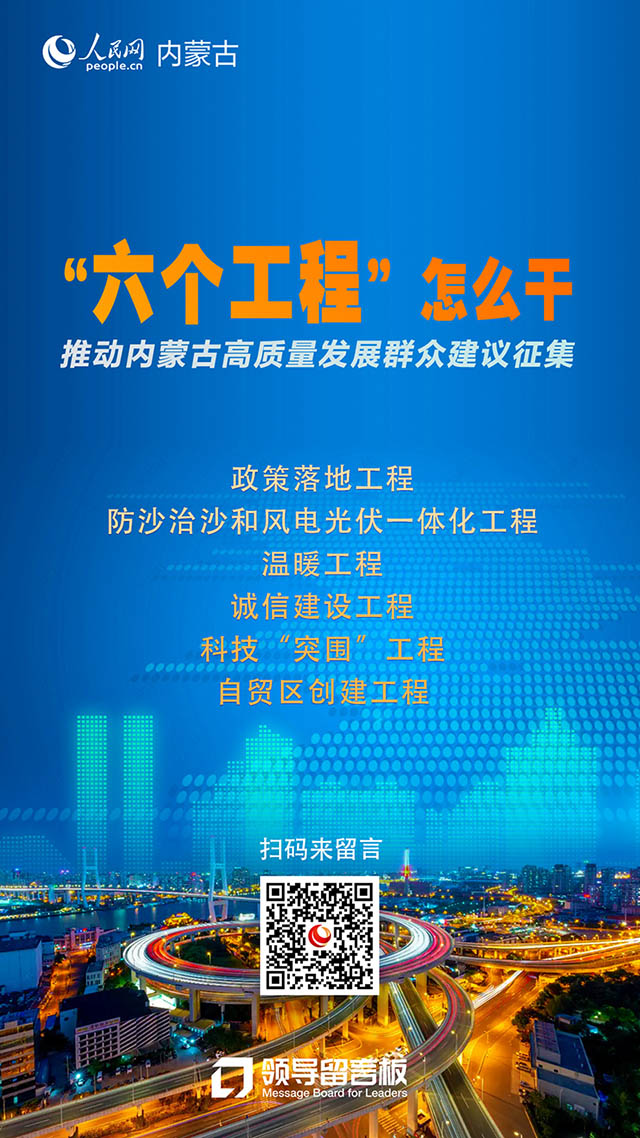 人民網(wǎng)呼和浩特4月3日電 (記者 張聿修)為集思廣益、凝心聚力,更好地服務(wù)在新征程上全面推進中國式現(xiàn)代化內(nèi)蒙古新實踐,內(nèi)蒙古自治區(qū)黨委督查室聯(lián)合人民網(wǎng)內(nèi)蒙古頻道推出“‘六個工程’怎么干——推動內(nèi)蒙古高質(zhì)量發(fā)展群眾建議征集”活動(點擊進專題),面向廣大群眾和社會各界人士征集對實施“六個工程”的意見建議,為新時代推動內(nèi)蒙古高質(zhì)量發(fā)展貢獻智慧力量。