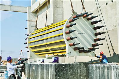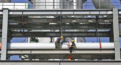 在位于包頭市的內蒙古通威硅能源20萬噸高純晶硅項目的施工現場,施工人員正在安裝設備。記者 孟和朝魯 攝