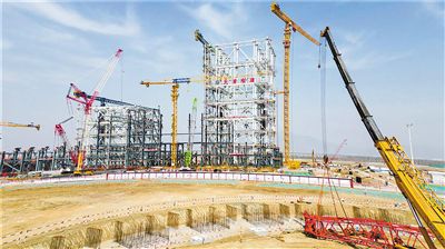 在內蒙古能源集團金山熱電廠三期項目施工現場,各類大型機械正在作業,1500余名施工人員在各個作業面開展工作。金山熱電廠三期項目建設2臺100萬千瓦高效超超臨界空冷燃煤供熱機組,投產后可實現年發電量100億千瓦時,為蒙西網最大出力機組。供熱面積5000萬平方米,可向呼和浩特城區輸送每小時1200噸工業蒸汽,年實現利稅3.9億元。