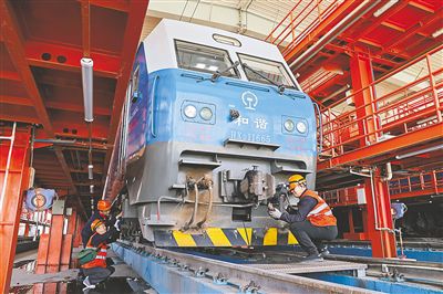 5月1日,中鐵呼和浩特局呼和浩特機務段呼和南整備車間職工在對重載機車進行檢修整備,為唐包鐵路萬噸煤炭運輸機車提供運輸保障。記者 馬駿馳 攝