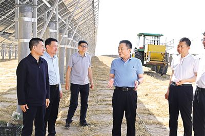 五月八日,自治區黨委書記孫紹騁來到蒙能光伏+生態治理示范區,詳細了解防沙治沙和風電光伏一體化工程開展情況。記者 馬建荃 攝