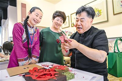 6月15日,中國剪紙(和林格爾剪紙)國家級代表性傳承人段建珺(右一)在非遺精品展上展示剪紙技藝。由自治區文化和旅游廳主辦的“弘揚北疆文化 促進文旅消費——北疆非物質文化遺產精品展”于6月15日至24日在內蒙古展覽館舉辦。展覽全方位、多角度解讀闡釋以鑄牢中華民族共同體意識為工作主線,以蒙古馬精神、“三北精神”為精神標識,以愛國、忠誠、團結、擔當為核心理念的北疆文化。記者 王磊 莊圓 攝