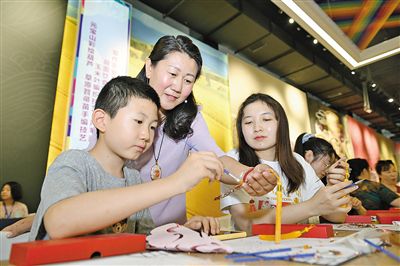 包頭剪紙傳承人郭婷(左二)指導市民剪紙。