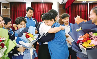 6月21日,呼和浩特市特殊教育學校高三畢業生與老師擁抱。當日,為了給初三和高三的畢業生留下一份美好的記憶,該校舉行了2024屆畢業生畢業典禮暨就業洽談會。截至目前,該校職業高中畢業生受聘于企業、自主創業的人數累計達200多人。同時,該校積極組織學生參加全國聾人單招高考,為殘疾學生繼續深造創造條件,目前已有50多名畢業生進入高等院校學習。記者 王磊 莊圓 攝
