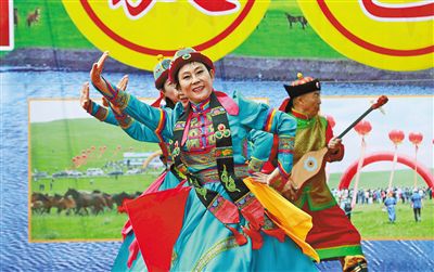 演員在內蒙古紅石崖國家生態公園舉行的草原文化旅游節上跳起安代舞,亮點紛呈的活動吸引了眾多游客。記者 孟和朝魯 攝