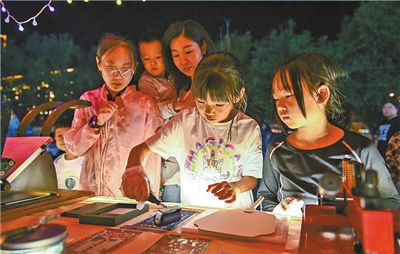 在北疆非遺夜市上,小朋友在體驗雕版印刷。