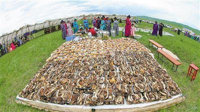 在呼倫貝爾市鄂溫克族自治旗錫尼河東蘇木舉行的布里亞特婚禮上,為游客準備了豐富的特色美食。布里亞特婚禮已被列入了旗級非物質文化遺產項目,成為了當地民俗旅游知名品牌。記者 李新軍 攝 (本版圖片除署名外均由記者 王磊 攝)