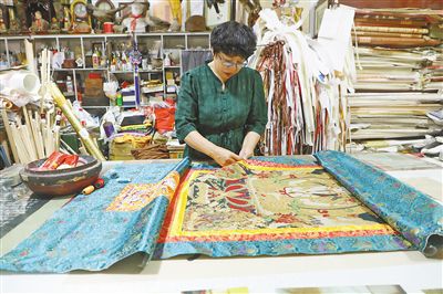在位于烏海市海勃灣區的韻悟齋文化傳承店內,自治區級非物質文化遺產名錄項目代表性傳承人許會英正在進行唐卡裝裱。記者 郝飚 攝