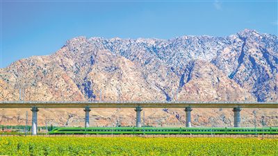 復(fù)興號(hào)列車“綠巨人”駛過(guò)一片向日葵地。張勁杰 攝