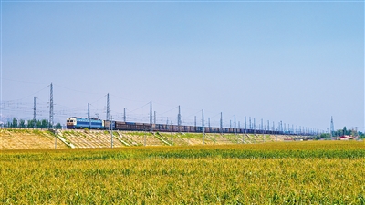 一列滿載貨物的列車行駛在包蘭鐵路線上。 張勁杰 攝