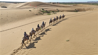 游客體驗騎駱駝游沙海活動。