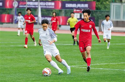 9月17日,上海申花(穿白色球衣)隊員正在比賽中帶球。當日,由中國足球協會主辦,呼和浩特市體育局、內蒙古足球協會承辦的中國足協U21聯賽第四階段比賽在呼和浩特市開賽。本階段呼和浩特賽區共有6支隊伍參加,分別為上海申花、長春亞泰、浙江俱樂部、深圳新鵬城、河南俱樂部、北京國安,所有隊伍均為中超梯隊,將進行5輪共15場比賽。記者 孟和朝魯 攝