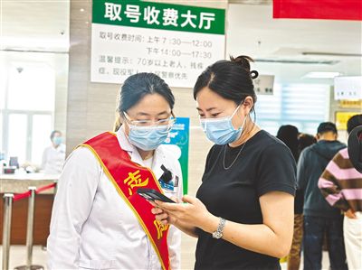 9月25日,導診人員指導患者使用“信用醫療”就診操作。內蒙古自治區人民醫院在全區率先推出先診療后付費的“信用醫療”模式。患者憑銀行信用,可實現先診療后付費,在門診就醫過程中,取消了排隊繳費環節,患者掛號后可直接到相應診區簽到就診,就診結束后兩日內與授信銀行進行一次性結算即可。記者 賈亦村 攝