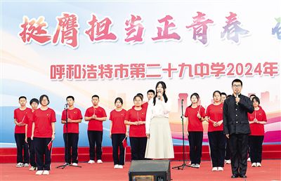 9月30日,學生誦讀《請黨放心強國有我》。為慶祝中華人民共和國成立75周年,展現當代中學生的精神風貌,當日,呼和浩特市第二十九中學2024年(第十一屆)校園文化藝術節啟幕,藝術節以“挺膺擔當正青春、奮楫揚帆向未來”為主題,通過豐富多彩的藝術活動,培養學生的創新精神和社會責任感,厚植愛國情懷。記者 懷特烏勒斯 攝