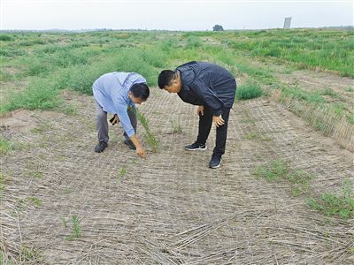 國(guó)家鄉(xiāng)村振興重點(diǎn)幫扶縣科右中旗科技特派團(tuán)牧草產(chǎn)業(yè)組科研人員在查看鹽堿地草原改良的堿茅出苗情況。