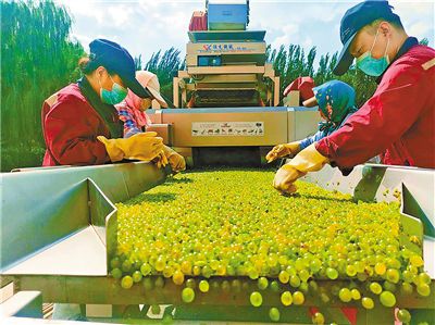 這些天,位于烏達區烏蘭淖爾鎮的吉奧尼酒莊迎來了一年中的開榨釀酒季。在酒莊的傳送帶兩旁,工人們將剔除了生青果、枝葉、爛果的釀酒葡萄以最快的速度運送到加工平臺進行二次篩選,之后還需經歷除梗、破碎、壓榨、浸漬、發酵、陳釀、過濾、裝瓶等復雜的程序和精細的工藝,才能完成晶瑩葡萄到醇香佳釀的華麗蛻變。