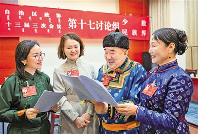 1月13日下午,在分組審議間隙,少數民族界政協委員就政協如何更好助力內蒙古高質量發展進行交流討論。 記者 孟和朝魯 攝