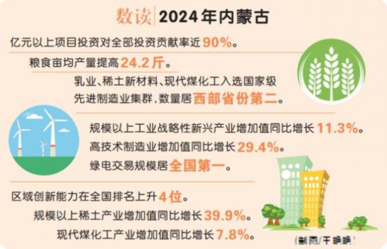 新賽道上,受益于高質量重大項目帶動,2024年,自治區綠電交易規模居全國第一;“蒙科聚”平臺技術合同成交額同比增長33.6%,全區凈增科技型中小企業853家、高新技術企業97家、科技領軍企業20家,乳業、稀土、氫、儲等領域取得一批填補行業空白的技術突破,內蒙古區域創新能力在全國排名上升4位;全區規模以上新能源及相關產業增加值同比增長20.1%,規模以上工業戰略性新興產業增加值同比增長11.3%,高技術制造業增加值同比增長29.4%……推動新興產業“強筋壯骨”、未來產業加速培育,內蒙古落子如飛!