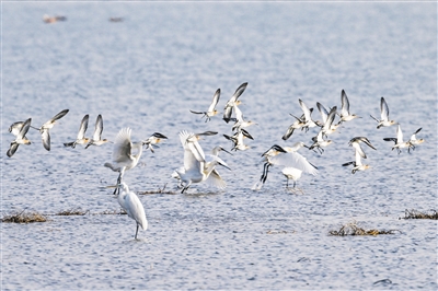 4月8日,在包頭市土右旗民利渠附近的黃河濕地,鵜鶘、鳳頭鸊鷉、白鷺、紅嘴鷗等候鳥覓食游弋,繪就出一幅人與自然和諧共生的壯美畫卷。包頭市位于全球候鳥九大主要遷徙線路之一的通道上,是候鳥遷徙的重要補給站。近年來,隨著黃河濕地生態環境的持續向好,監測到的野生鳥類種類和數量逐年增多。記者 王曉博 攝