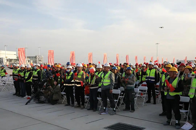 演出結束后,建設者們有序離場。舞臺燈光漸暗時,遠處航站樓工地依然閃爍著光亮。夜幕下,焊花與星光交相輝映,奏響新時代的勞動贊歌。(劉旭亮)