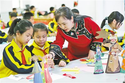 非物質(zhì)文化遺產(chǎn)代表性傳承人指導(dǎo)學(xué)生制作哈尼卡。
