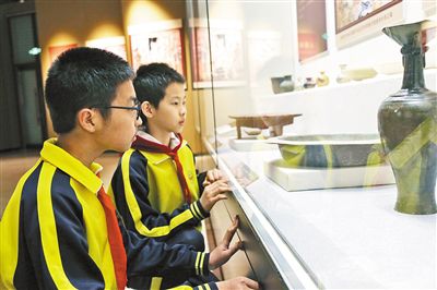 學(xué)生們?cè)诓┪镳^參觀。