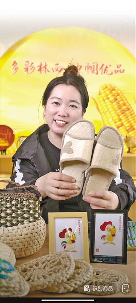 在林西縣巾幗電商銷售平臺,玉米皮制成的拖鞋、小筐、隔熱墊等產品正在直播間同步銷售。