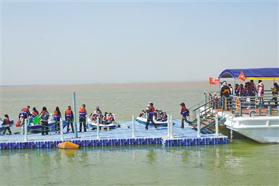 在烏海湖休閑度假旅游區,游客排隊乘船,只為一睹“沙水共生”奇幻景觀。 郝鑫 攝