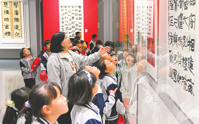 5月9日,小學(xué)生們在老師的引導(dǎo)下欣賞書法作品。當(dāng)日,“翰墨同歌書華章”五城市書法作品聯(lián)展在內(nèi)蒙古美術(shù)館開展,展覽共展出150件來自呼和浩特、包頭、烏蘭察布、鄂爾多斯、烏海五市書法愛好者的書法作品。記者 王磊 攝