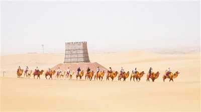 游客在大漠旅游的同時參加沙漠植樹活動。