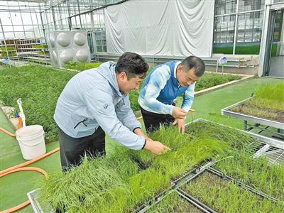 興安北京現(xiàn)代畜牧業(yè)科創(chuàng)中心草產(chǎn)業(yè)園里,科研人員在查看羊草長勢。(受訪單位供圖)
