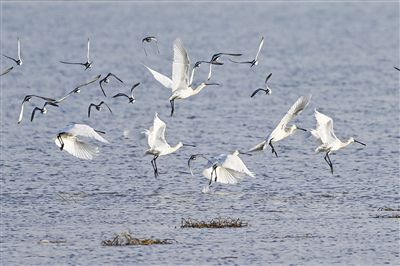 包頭市土右旗黃河濕地,鵜鶘、鳳頭鸊鷉、白鷺、紅嘴鷗等眾多候鳥正在覓食游弋飛翔棲息。記者 王曉博 攝