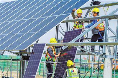 6月10日,鄂爾多斯市達拉特旗50萬千瓦光伏治沙一體化項目正在緊張有序開展施工。該項目為“三北”工程攻堅戰重點項目,采用“光伏+治沙”模式。項目全容量并網后,預計每年可提供8.5億千瓦時清潔電能,節約標準煤26萬噸,減少二氧化碳排放72萬噸。記者 王曉博攝