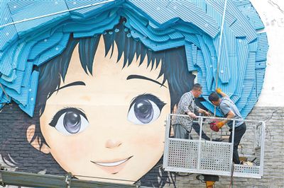 工人們裝飾彩繪墻體,打造網紅打卡地。
