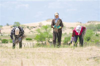 7月1日,在赤峰市克什克騰旗渾善達克沙地綜合治理工程紅山子鄉薩嶺河項目區內,工人正在種植檸條、麻黃草。克什克騰旗通過“工程固沙+灌木造林+人工種草”的立體綜合治理模式,全力推進治沙工作。同時,大力發展特色經濟林、灌木飼料林等產業基地,實現生態治理與經濟發展的良性互動。該旗今年計劃完成治沙114萬畝,截至目前已完成76萬畝。記者 孟和朝魯攝