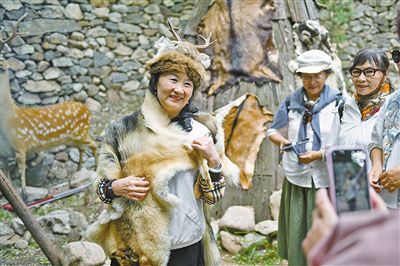 游客在呼和浩特市莫尼山非遺小鎮鄂倫春族生活場景打卡。