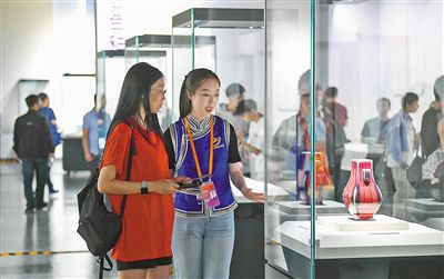 志愿者在內蒙古博物院新館為游客介紹展出文物。