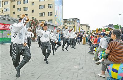 在呼和浩特市回民區通道街濱河路社區,錫林郭勒盟太仆寺旗烏蘭牧騎隊員們為居民開展惠民演出。