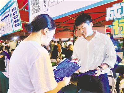 7月12日,求職者(左)向招聘企業(yè)了解崗位信息。當(dāng)日,呼和浩特市回民區(qū)人社局在新華廣場舉辦“夜市‘職’通車 燈火照前程”招聘會,吸引眾多求職者與招聘企業(yè)參與。今年以來,回民區(qū)人社局創(chuàng)新“就業(yè)服務(wù)+夜市經(jīng)濟”模式,進(jìn)一步拓寬求職者就業(yè)渠道。記者 丁月濃攝