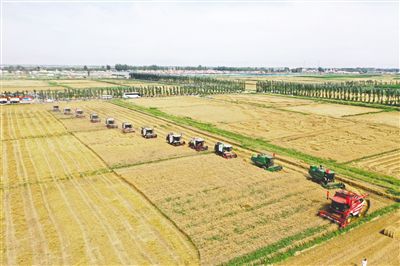 7月18日,在臨河區狼山鎮巴彥淖爾國家農高區萬畝硬質小麥示范園區,13臺大型聯合收割機同時作業收割小麥,標志著巴彥淖爾市60.72萬畝小麥全面開鐮收割。據了解,該市共組織800余臺收割機投入搶收工作,確保顆粒歸倉。記者 圖古斯畢力格 攝