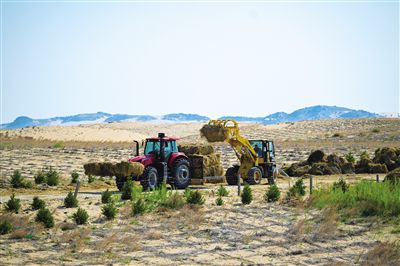 7月24日,赤峰市翁牛特旗科爾沁沙地其白線項(xiàng)目區(qū),治沙工人正在運(yùn)送制作沙障的稻草。翁牛特旗在科爾沁沙地殲滅戰(zhàn)中,通過(guò)修建穿沙公路,分割沙區(qū)、直穿沙區(qū)內(nèi)部,并從公路兩側(cè)向外延展,開(kāi)展沙地綜合治理。截至目前,翁牛特旗累計(jì)開(kāi)通烏白路、阿浩線等17條穿沙公路,沿路治理面積達(dá)560萬(wàn)畝,形成了“六橫十一縱”的治沙公路格局,為沙地治理攻堅(jiān)闖出新路。記者 孟和朝魯攝