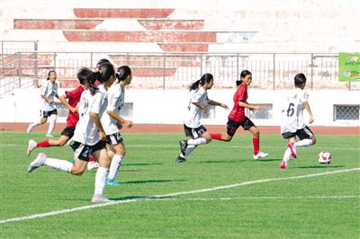 7月28日,在呼和浩特市青少年足球訓(xùn)練基地,女子U13-U14組別包頭一隊(duì)球員(白色)與赤峰二隊(duì)球員正在爭搶球權(quán)。當(dāng)日,內(nèi)蒙古自治區(qū)第二屆青少年三大球運(yùn)動(dòng)會暨內(nèi)蒙古自治區(qū)青少年足球、籃球、排球錦標(biāo)賽的足球項(xiàng)目開賽。本屆賽事共有來自全區(qū)12個(gè)盟市的200余支代表隊(duì)、近4000名青少年運(yùn)動(dòng)員參賽。記者 懷特烏勒斯攝