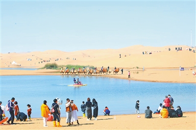烏海湖的形成為發展旅游業提供了重要支撐。結合烏海湖景區大湖、大漠的資源優勢,烏海市組建烏海文旅集團,開發了水上環湖觀光游、沙海體驗游、小火車觀光游等旅游路線,并拓展了游艇、快艇、水上飛人、沙漠越野車、沙漠駱駝等20余種水上沙漠娛樂項目。自此“來沙漠看海”成為烏海市最為響亮的旅游標語。