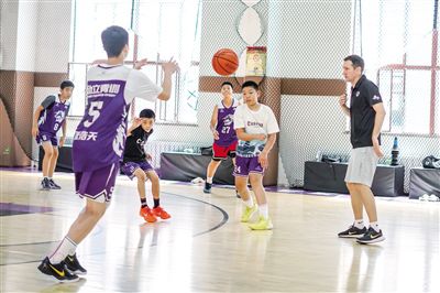 8月6日,一名塞爾維亞籍籃球教練在呼和浩特市玉泉區制鎖廠勱立體育文化產業園籃球中心指導孩子們進行籃球訓練。勱立體育文化產業園是城市更新項目,由閑置的老廠房轉變為充滿活力的運動場地,暑假期間,不少學生選擇來這里參加體育運動。記者 王曉博攝