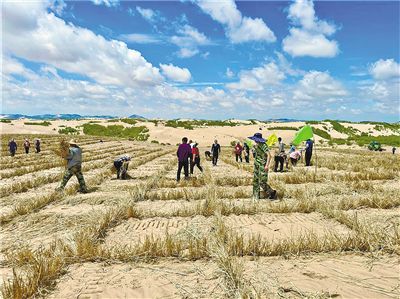 治沙工人在科爾沁沙地治理區(qū)作業(yè)。